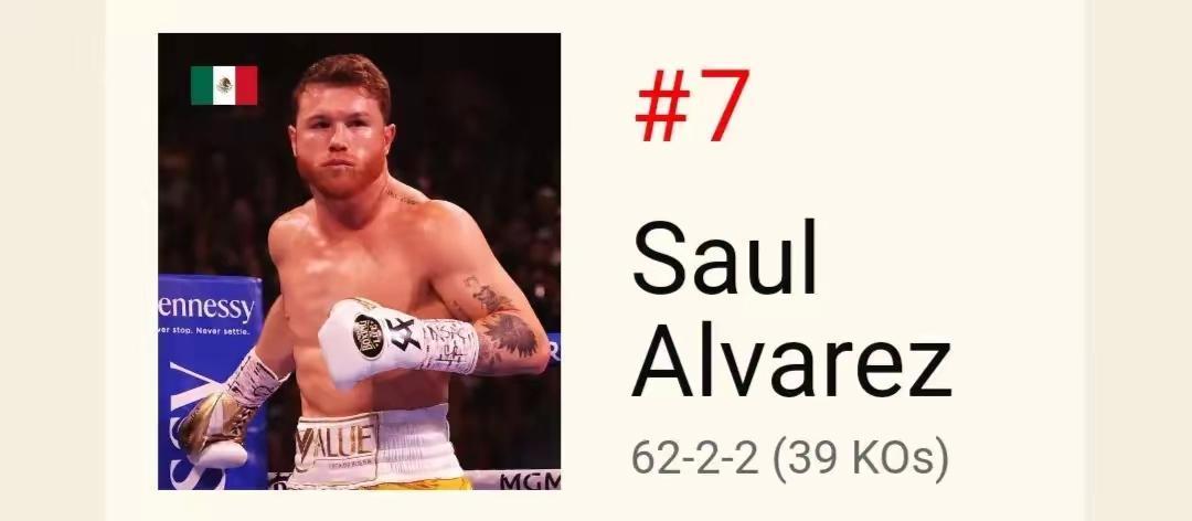 排名第7的是墨西哥拳击旗子性东谈主物阿瓦雷兹,尽管他此前输给了比沃尔,但回到168磅最近打的几场发扬还可以。