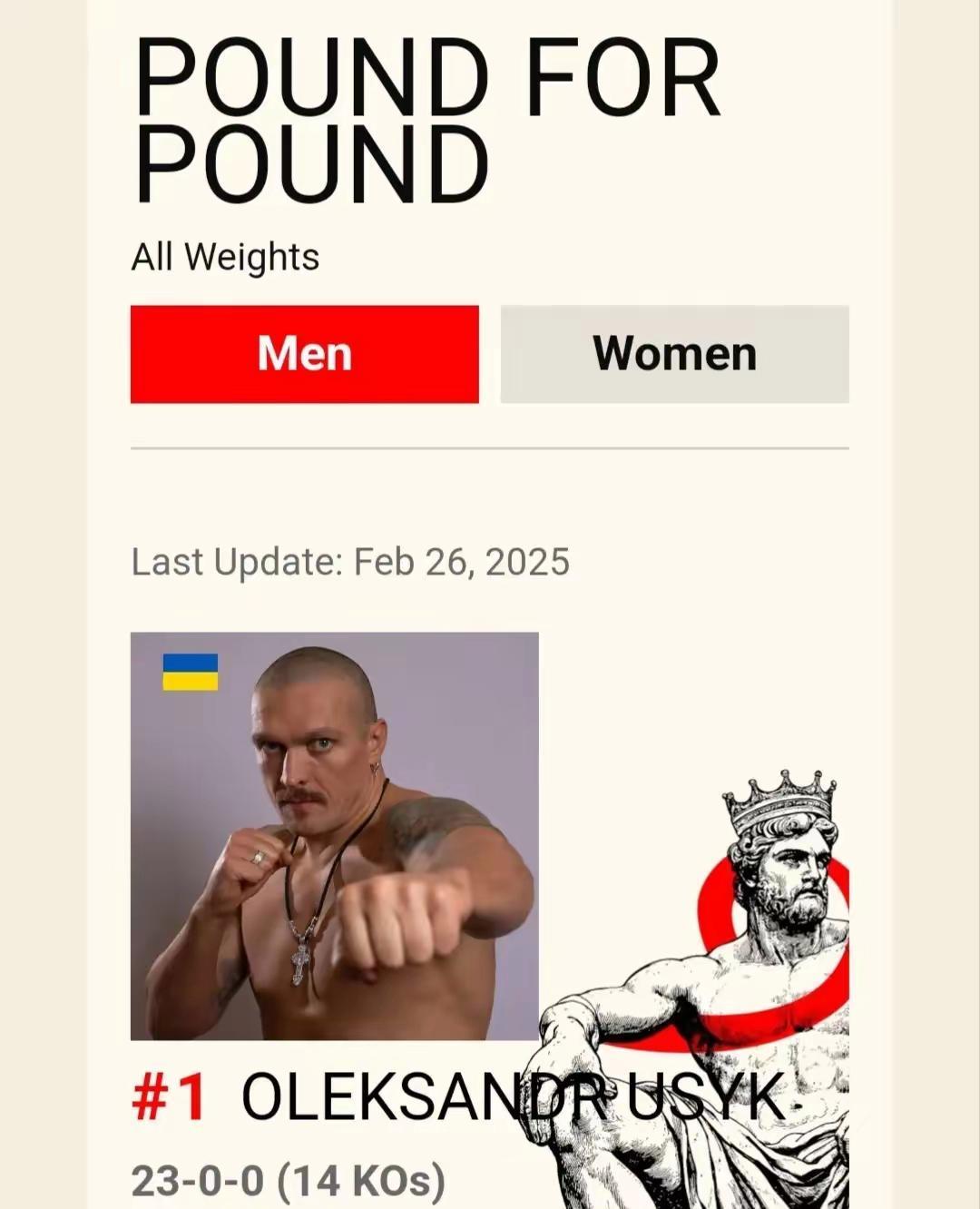 需要指出的是,P4P是POUND FOR POUND的缩写,就是指不计体重各异,将男人统共17个级别的拳手融入到一谈排序,以评比出最优秀的一群东谈主。在新公布的名次榜上,高居榜首的如故分量级三冠王乌西克,他凭借旧年双杀泰森·富里,成为历史上首位消除分量级四大组织的拳手,进而被永恒载入汗青。