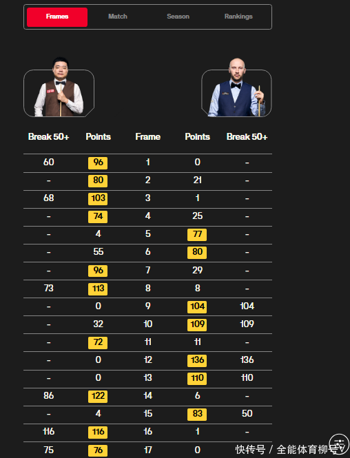 第九局同期亦然第一阶段临了一局,舒尔第又送出单杆67分,86-0零封科瓦尔斯基,比分形成8-1。休息归来之后,第十局,舒尔第打出单杆58分,67-59拿下,9-1进一步扩大逾越上风,并获取八个赛点。